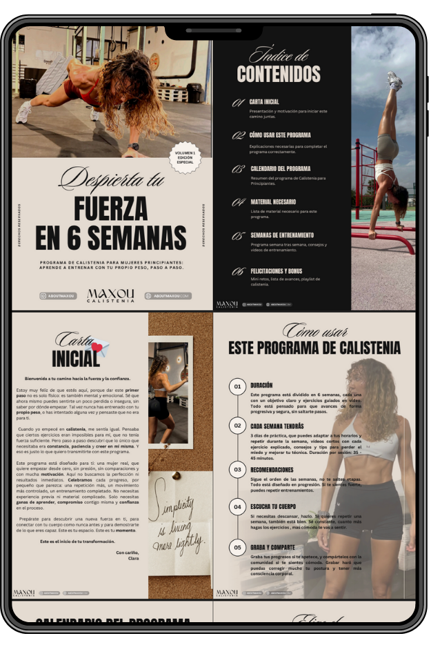 es un programa de calistenia diseñado para mujeres principiantes que quieren ganar fuerza, mejorar su forma física y sentirse seguras entrenando con su propio cuerpo, desde cualquier lugar.